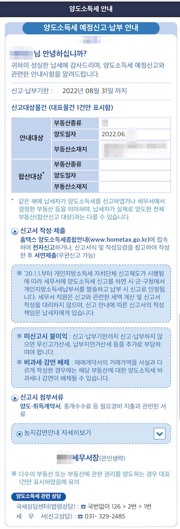 얼마 전 카톡으로 6월에 경매로 취득한 물건에 대한 양도소득세 세금 신고 안내문이 도착했습니다.