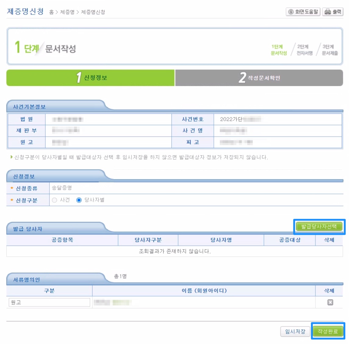발급 당사자가 모두 들어갔으니 작성완료 버튼을 클릭합니다.