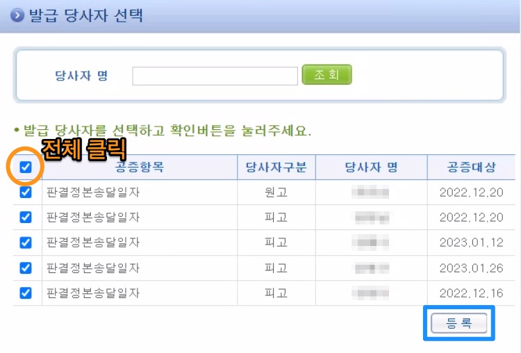 발급 당사자 전체를 선택해주고 등록 버튼 클릭하세요