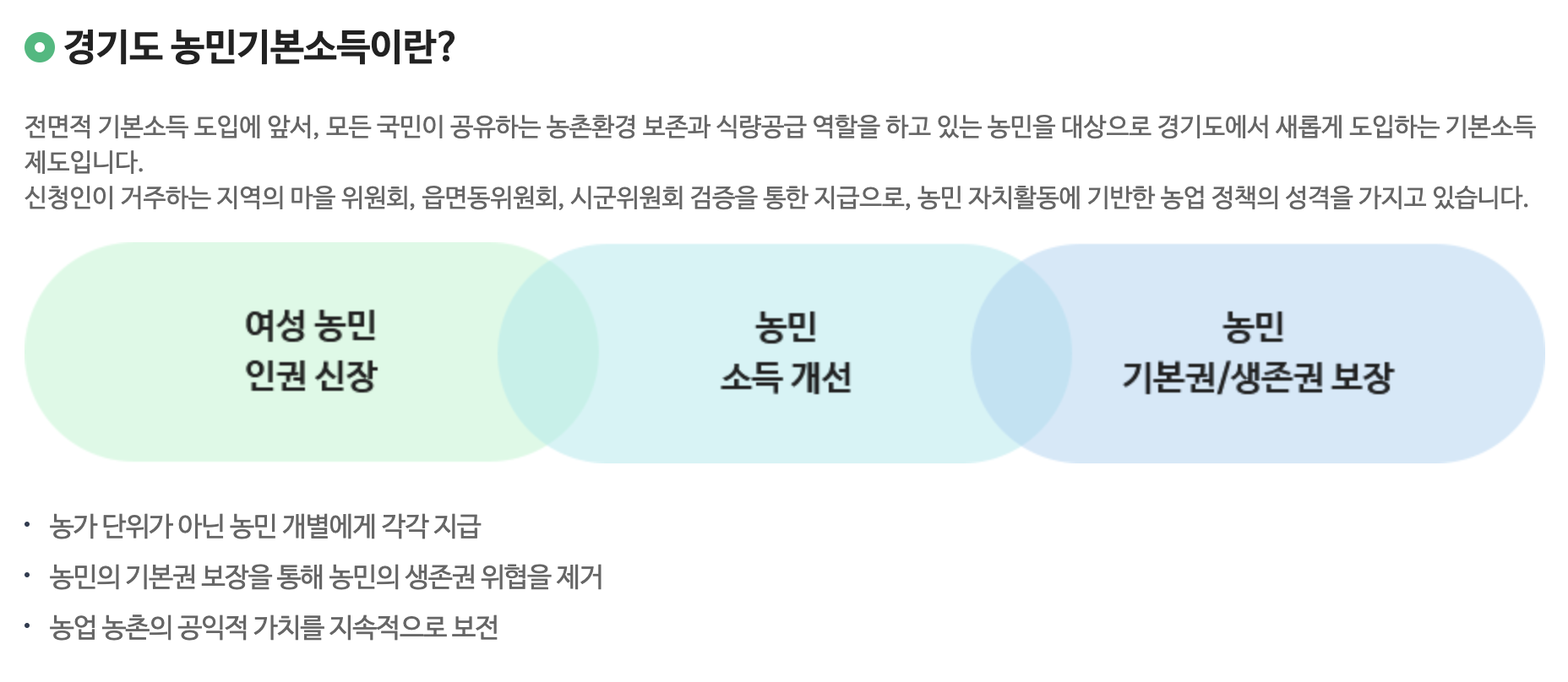 전면적 기본소득 도입에 앞서, 모든 국민이 공유하는 농촌환경 보존과 식량공급 역할을 하고 있는 농민을 대상으로 경기도에서 새롭게 도입하는 기본소득 제도입니다.