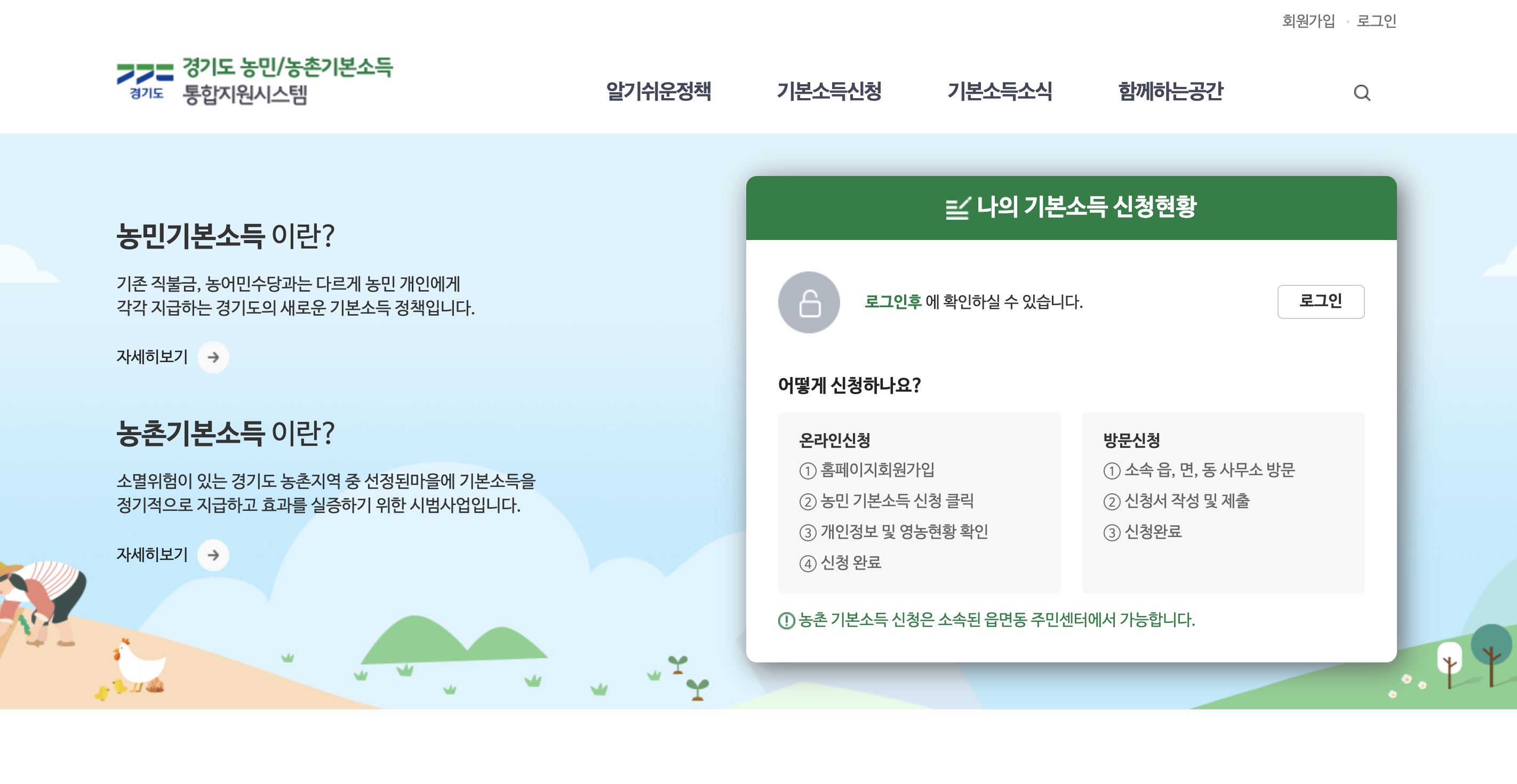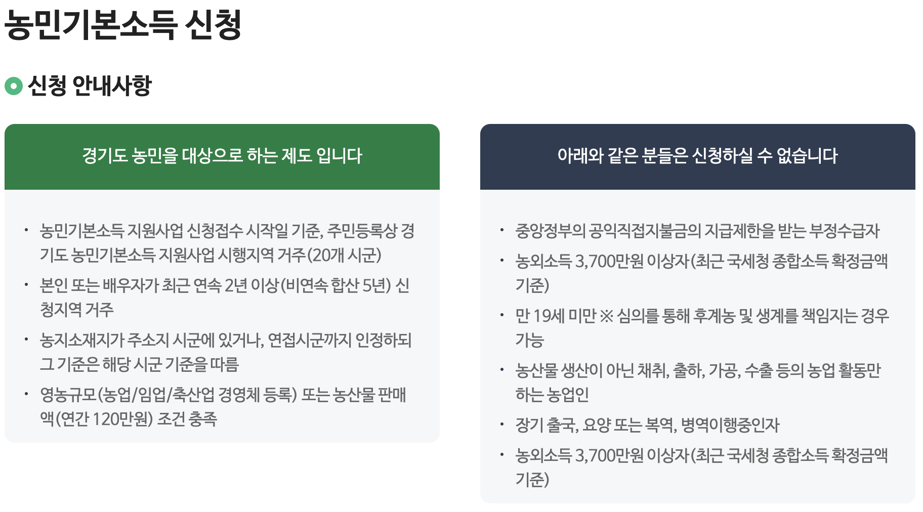 신청방법: 구청 및 읍ㆍ면 행정복지센터 방문 또는 농민기본소득 통합지원 시스템(https://farmbincome.gg.go.kr/)으로 신청
