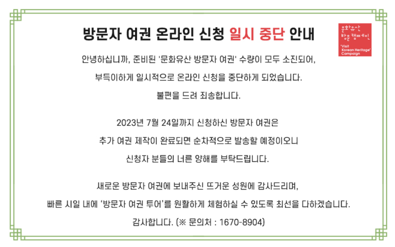 현재는 방문자 여권이 동난 상태라 온라인 신청이 잠시 중단되었습니다.