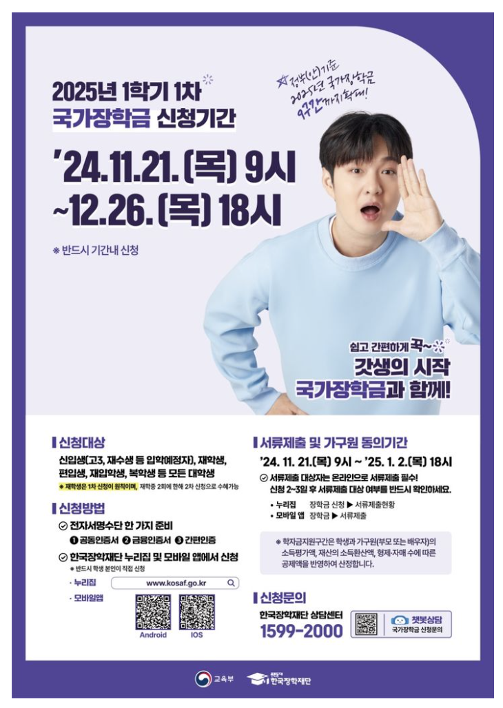 2025년 1학기 1차 국가장학금 신청기간은 24. 11.21 (목) 9시 ~ 12.26 (목) 18시입니다. 반드시 기간 내 신청해야 하니 일정을 꼭 기억하시기 바랍니다.