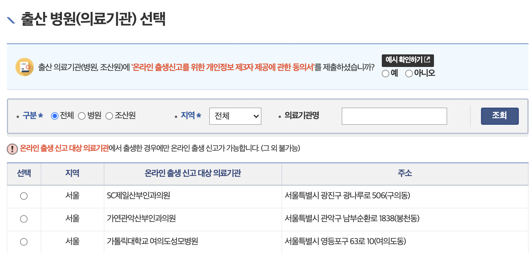 온라인 출생신고하려는 의료기관을 선택하세요.