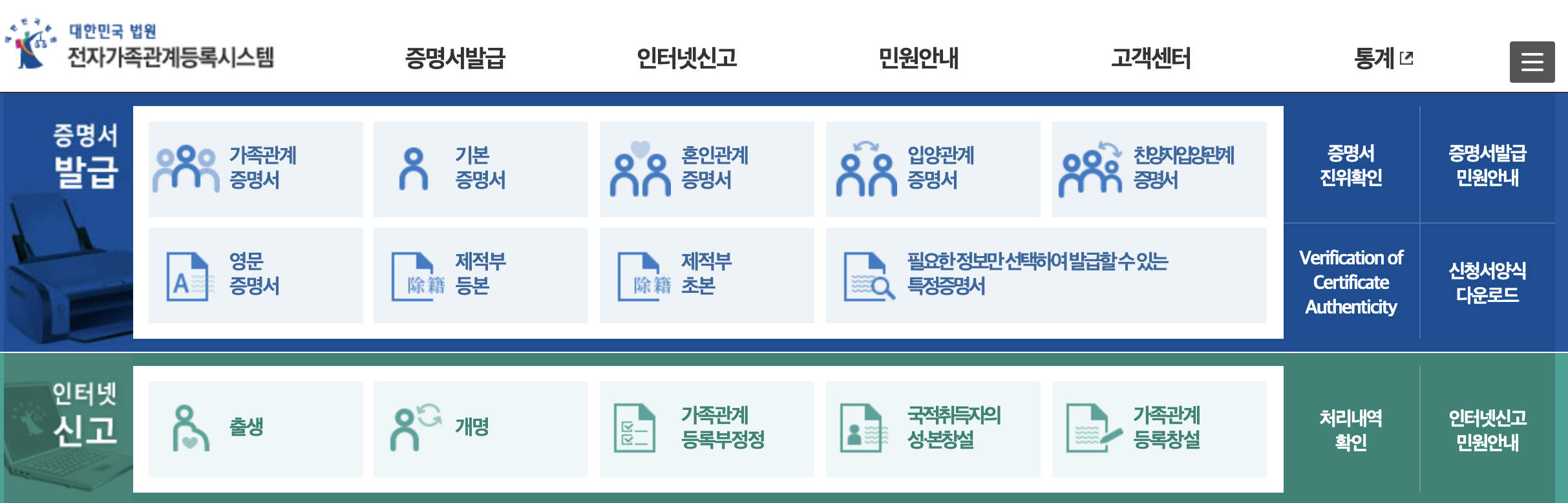 가족관계증명서 본인과 부모, 배우자, 자녀에 관한 사항이 기재되는 증명서입니다. 자세히 보기 기본증명서 본인의 출생, 사망, 국적 등에 관한 사항이 기재되는 증명서입니다. 자세히 보기 혼