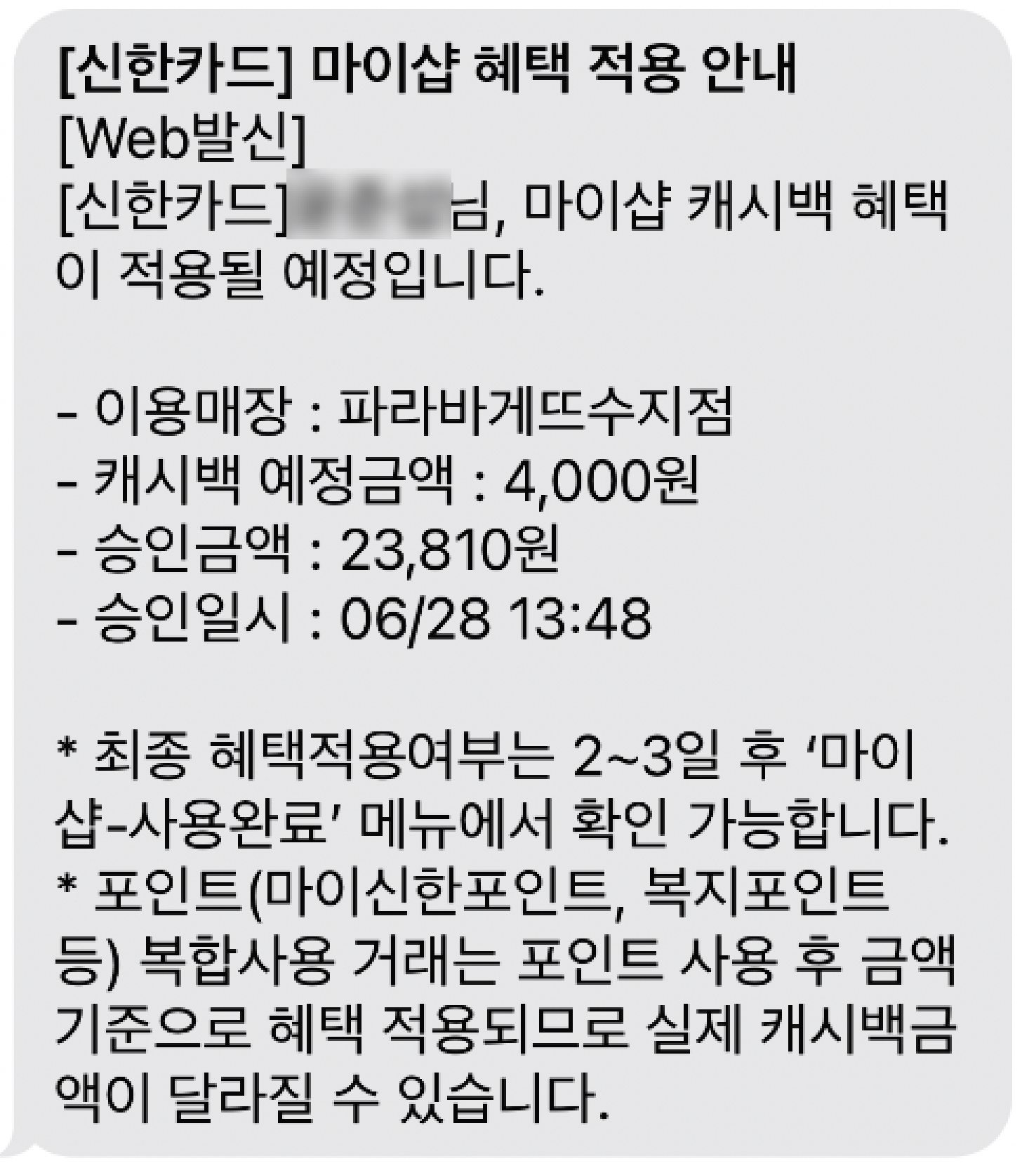 실제로 결제해보니까 이렇게 문자까지 오면서 혜택이 적용될 것을 고지해줍니다~!