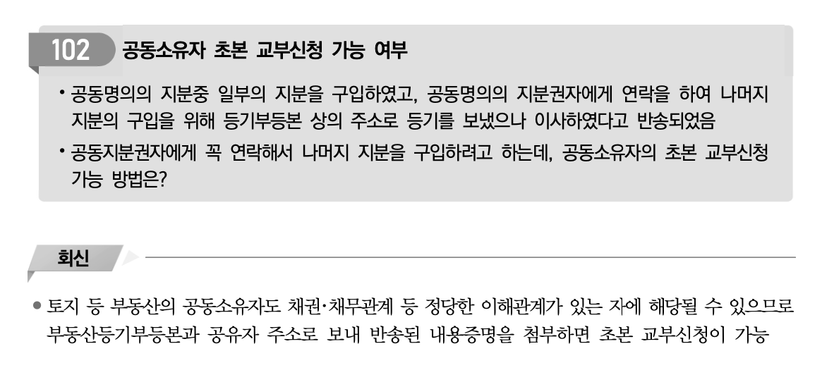 토지 등 부동산의 공동소유자도 채권・채무관계 등 정당한 이해관계가 있는 자에 해당될 수 있으므로 부동산등기부등본과 공유자 주소로 보내 반송된 내용증명을 첨부하면 초본 교부신청이 가능