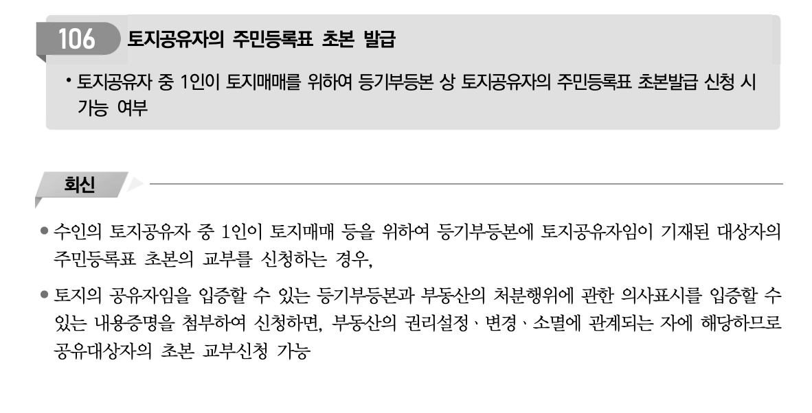 수인의 토지공유자 중 1인이 토지매매 등을 위하여 등기부등본에 토지공유자임이 기재된 대상자의 주민등록표 초본의 교부를 신청하는 경우,