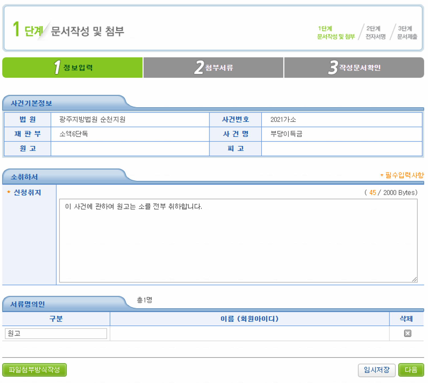 단독으로 소를 진행하였다면 그냥 아무 서류 첨부 없이 작성완료로 다음 단계로 넘어가시면 되고