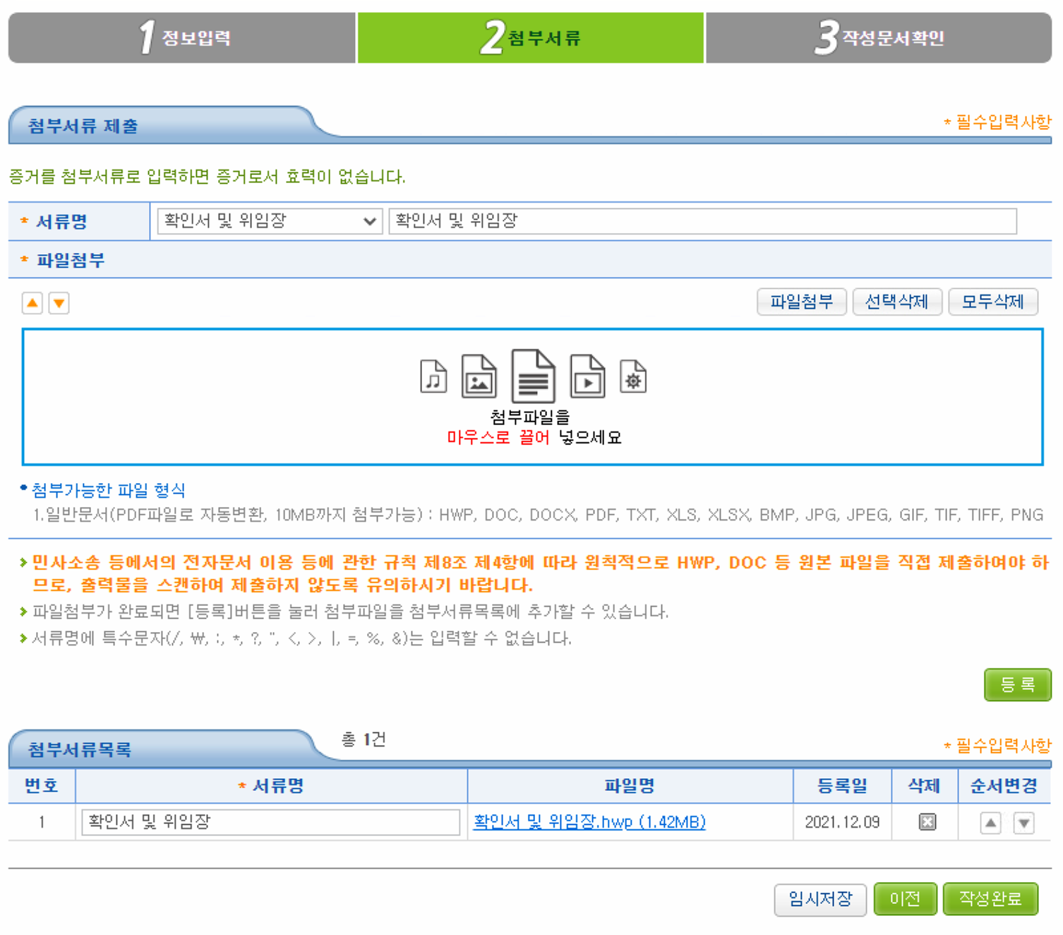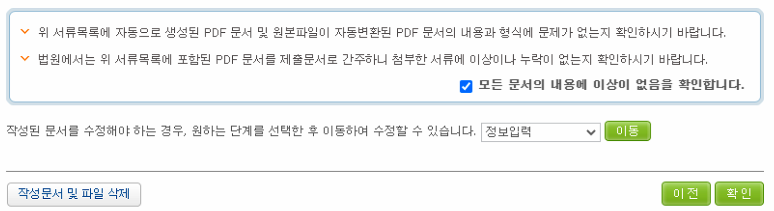 단독으로 소를 진행하였다면 그냥 아무 서류 첨부 없이 작성완료로 다음 단계로 넘어가시면 되고