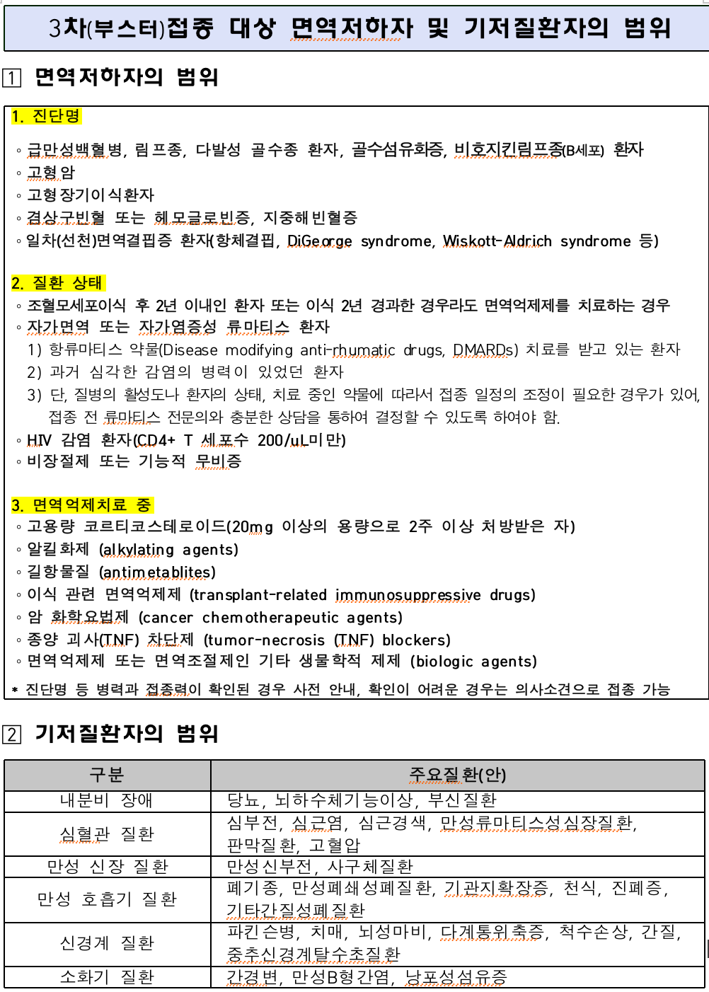 * 기저질환자 및 면역저하자의 범위는 코로나19예방접종누리집 > 알림・서식 > 안내문 > "3차(부스터) 접종 면역저하자 및 기저질환자 범위" 참조