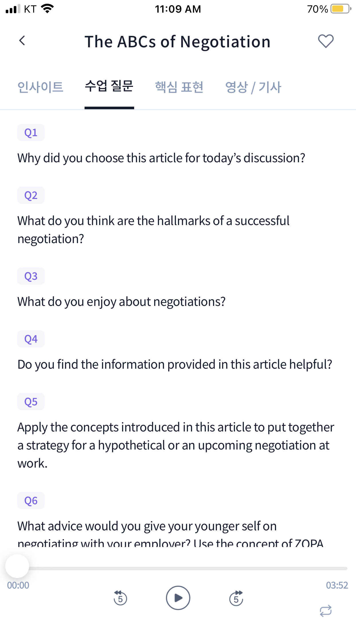 처음에 튜터가 자기 소개를 하고 저에 대해 물어봅니다. 간략하게 자기소개를 마친 뒤에 제가 미리 선정한 두 가지 질문을 통해 주제에 대한 대화를 합니다. 저는 협상에 대해 더 많이 이야기 할 줄 알았는데 아주 간단하게 이야기를 마친 뒤 그냥 프리토킹 형식으로 넘어갔습니다. 전문적인 지식에 대한 토론을 할 수 있다는 기대를 했었는데 조금 아쉬웠습니다. 수업 시간을 5분간 남겨두고 제가 말한 잘못된 표현에 대해 조언을 해주셨습니다.