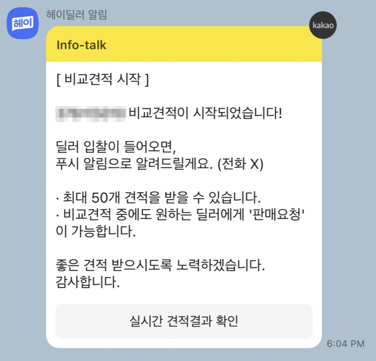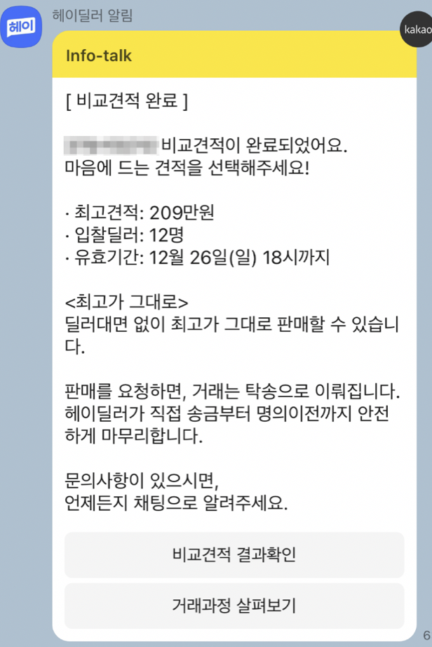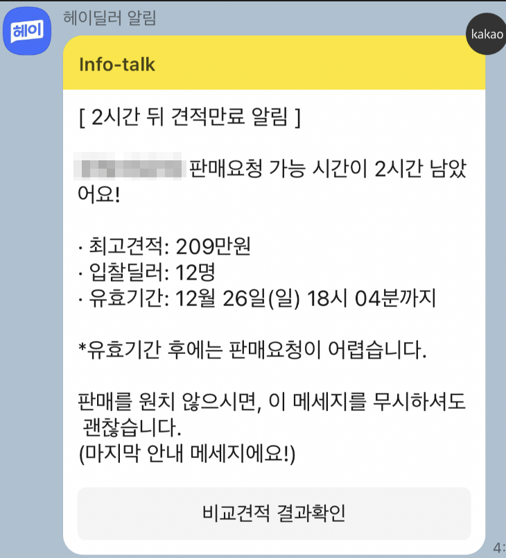 평가사님이 감정평가를 마치시고 나면 곧 비교견적이 시작되었다는 알림메시지가 오게 되며 딜러 입찰이 들어오면 푸시 알림으로 알려줍니다.