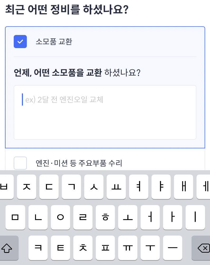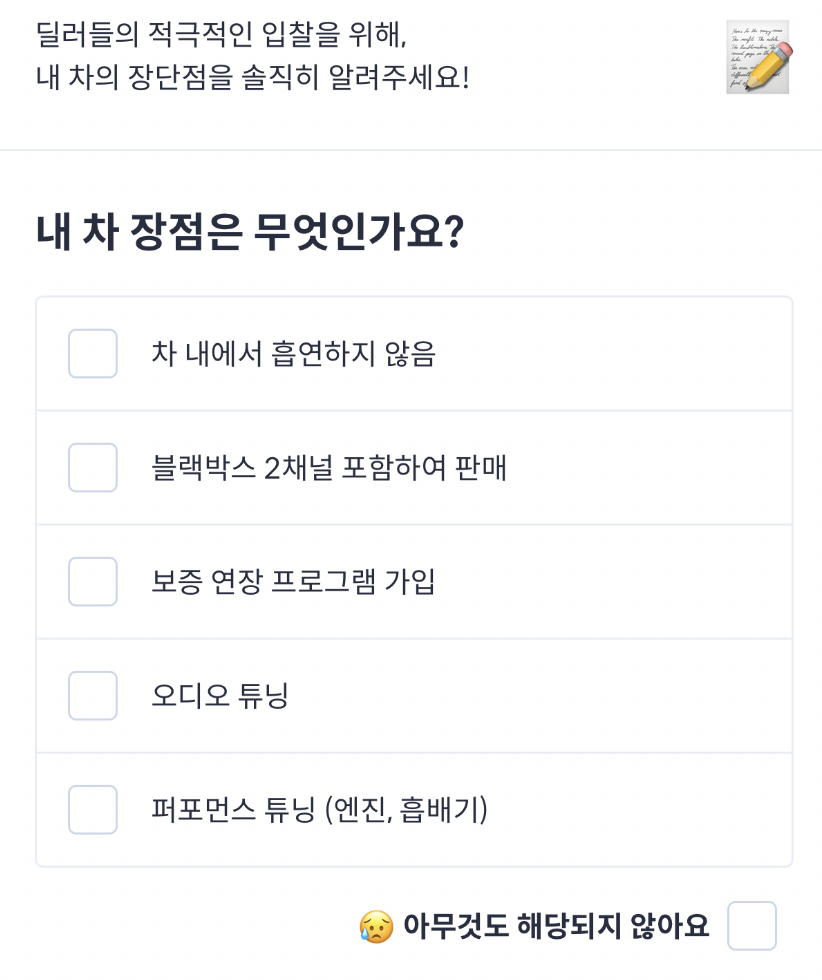 문진표 작성을 누르시면 내 차 장점 및 정비 내역에 관해서 작성할 수 있게 됩니다.