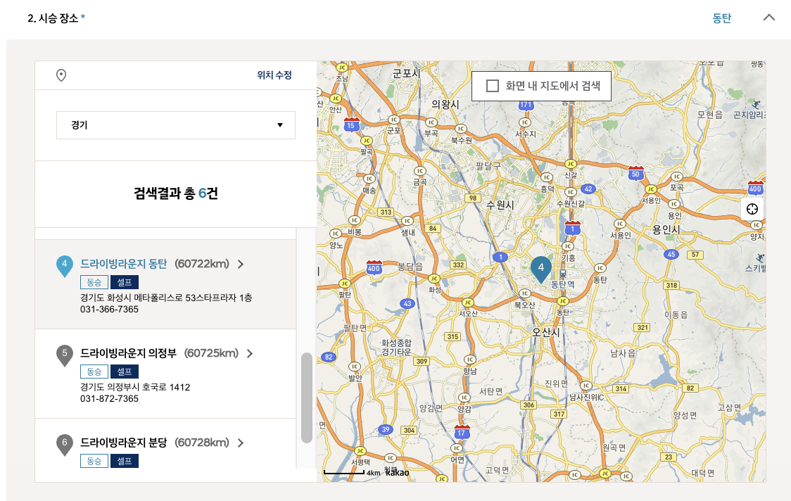현재 위치를 설정하여 시승 센터를 선택합니다.